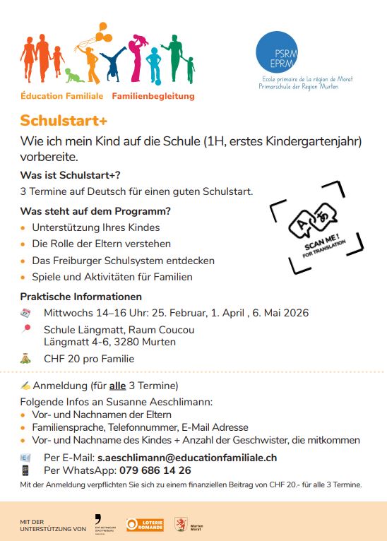 Mit drei Terminen auf Deutsch informiert Schulstart+ Sie über das Freiburger Schulsystem, klärt Sie über Ihre Rolle als Eltern in Bezug auf die Schule auf und unterstützt Ihr Kind. Das erste Treffen findet am 25. Februar statt.