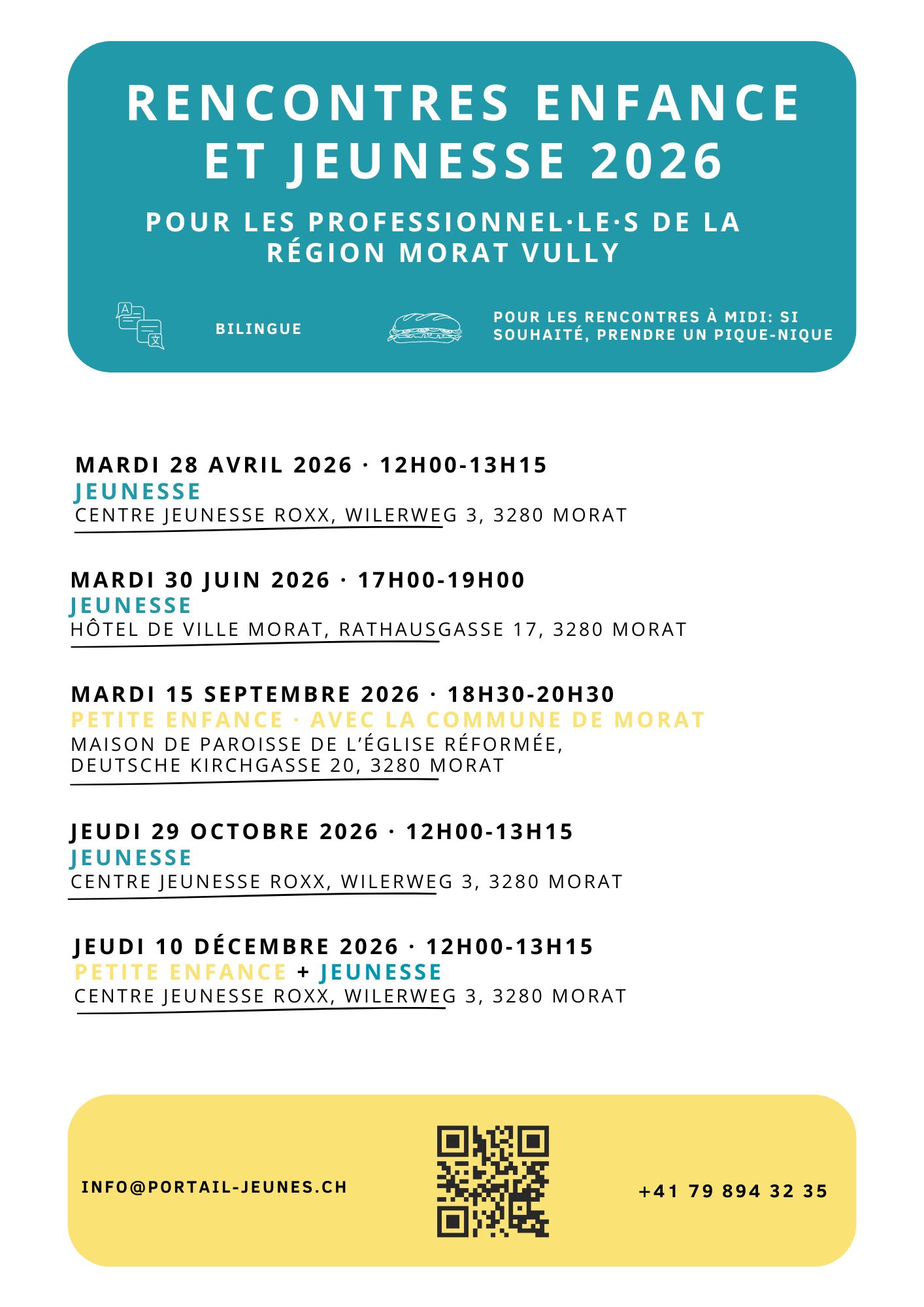 En collaboration avec différents partenaires de la région, Portail Jeunes organise des événements de mise en réseau, à midi ou en soirée, tout au long de l’année, pour les professionnel·le·s. Ces rencontres visent à se connaître et à échanger autour de thèmes liés à l’enfance et à la jeunesse.